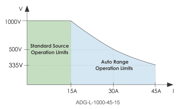 相较于一般的直流电源,宽量程 (Auto Range) 的直流电源具备更宽广的电压和电流操作范围,如图所示,一般的直流电源在所有的电压段只能提供相同的最大电流,而宽量程的直流电源则能在较低压输出时,提供较高的最大电流。 ADG-L 系列中的多个机型已具备宽量程之功能,方便使用者能用一台直流电源,满足高压低电流及低压高电流的应用,大幅节省成本及空间。